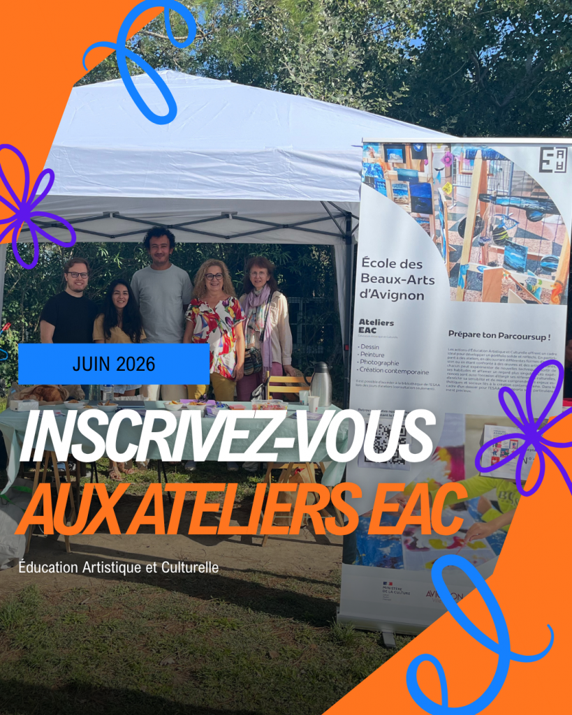 Depuis 2021, l’École supérieure d’art d’Avignon mène une politique d’Éducation Artistique et Culturelle active à travers ses ateliers libres. On notera en particulier le partenariat avec le Festival d’Avignon et la tenue d’atelier à destination du jeune public, ainsi que la réalisation de la brochure jeune public en 2021. On notera également la participation au Festival “C’est pas du luxe” depuis 2018, en particulier la proposition de quatre ateliers par les intervenant·e·s des ateliers de pratique amateur.